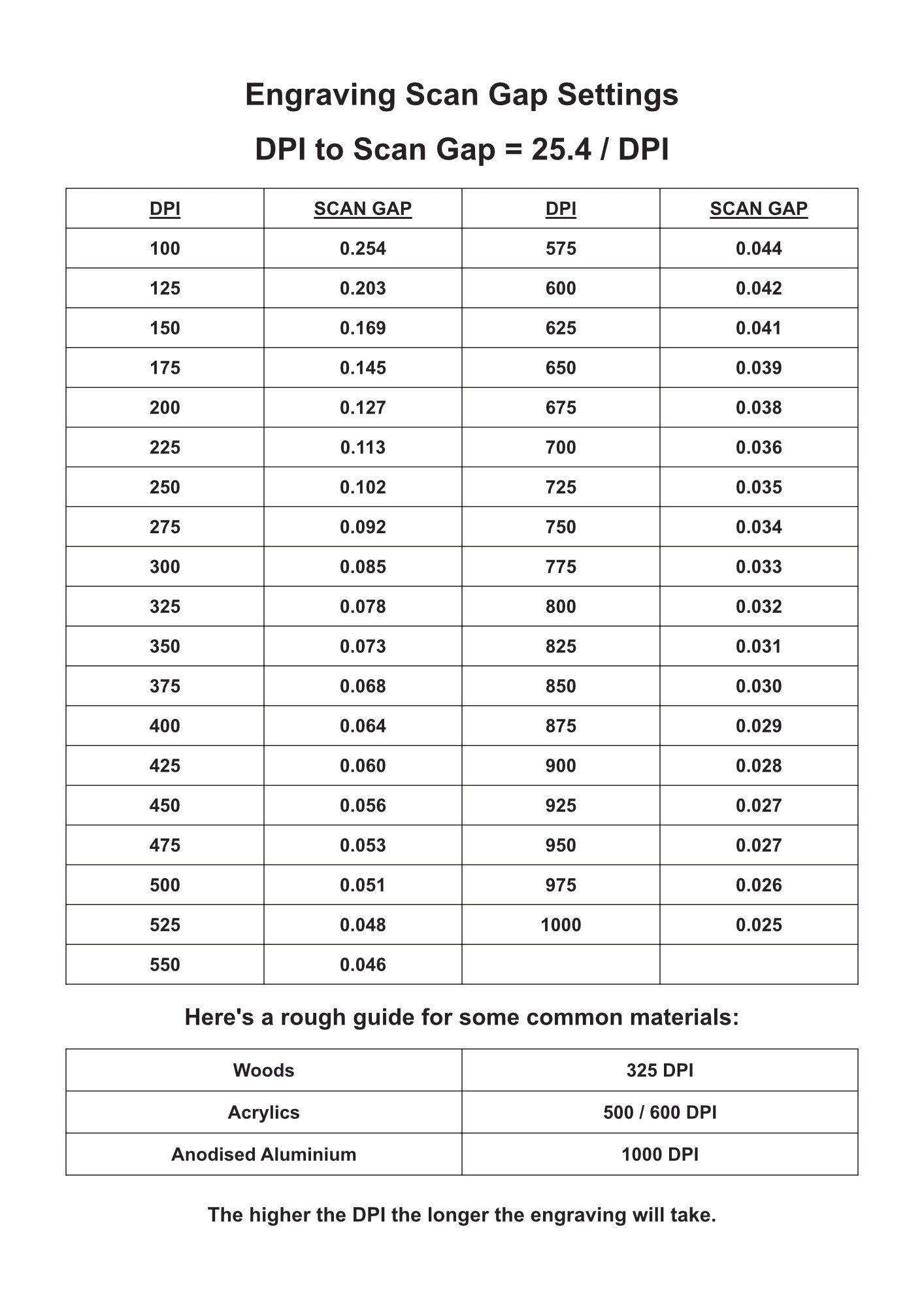Click to download and print our A4 Laser Engraving Scan Gap Settings PDF as a reference for engraving different material types.