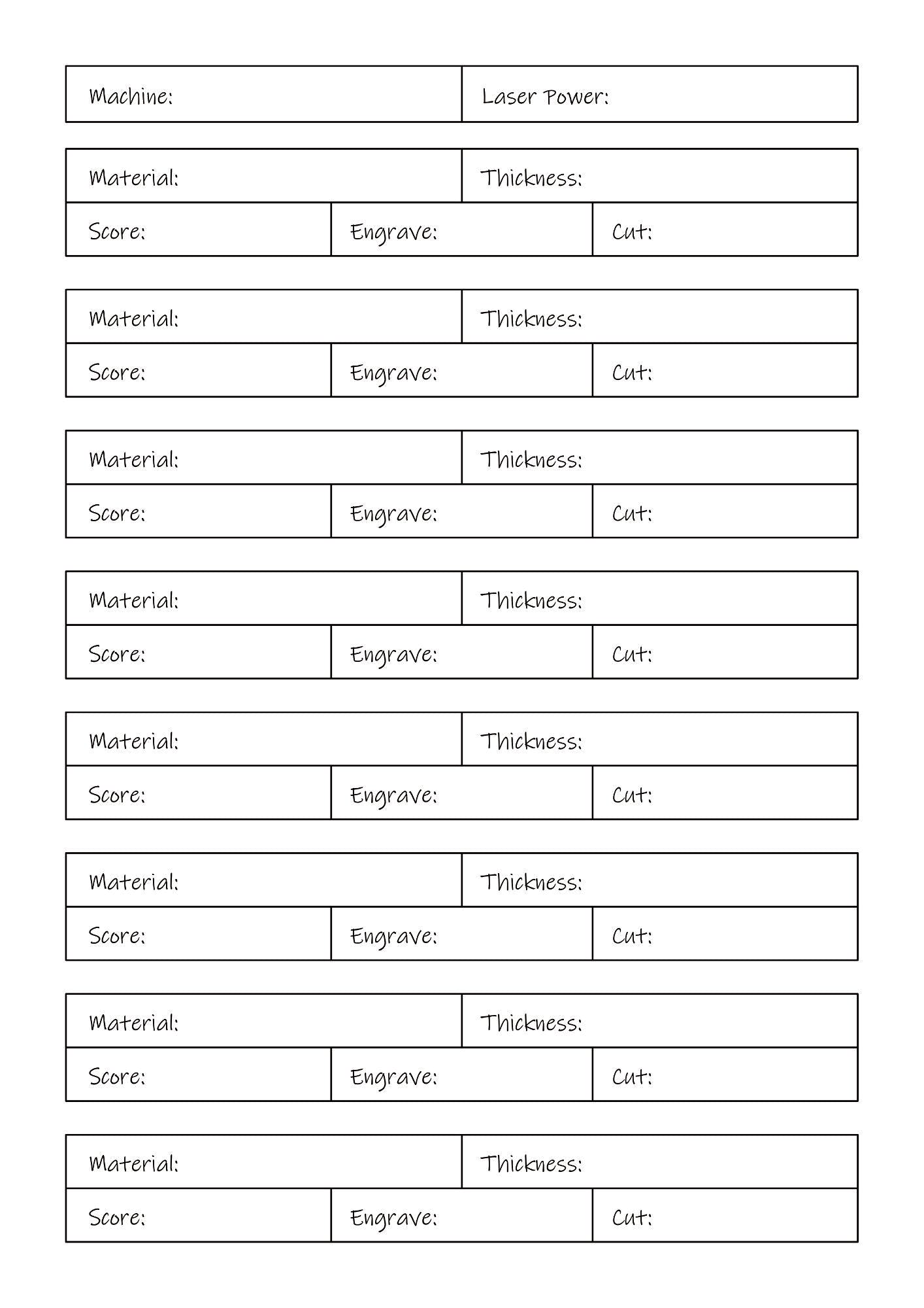 Click to download and print our A4 Laser Material Speed and Power Tracker PDF as a reference for cutting and engraving different material types.
